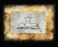 This flag resulted from a demand of the Mexicans on the Texans who had gathered at Gonzales to give up a cannon the Texans had borrowed from the Mexican garrison at San Antonio. The cannon was lent to the Texans in order to help them defend Gonzales from Indian attacks. (Click on Flag image for larger view)