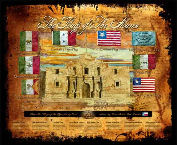 Which flag or flags actually flew over the Alamo? A few we know for sure, others we speculate flew during the siege. Here I have illustrated which ones I believe flew during the siege by Santa Anna's troops. This poster is comprised of several of my water color originals which I have put together to create one image of the Alamo and the flags.
