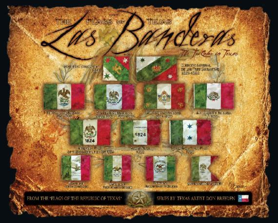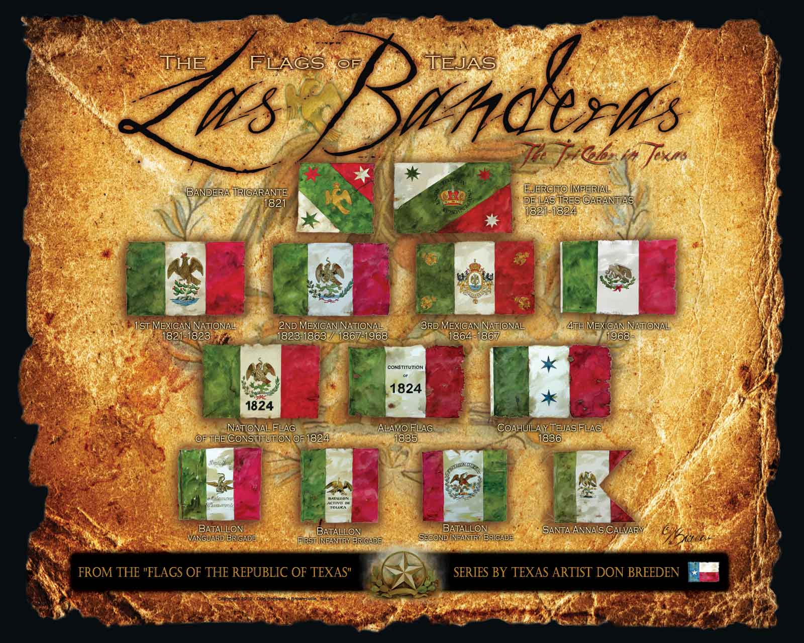 The Tri-Color flags in Texas! This is a collection of some of the most colorful flags flown over Texas. Many are the Mexican National flags as well as some of the Mexican Batalions, and others are the Tri-Color Texas flags. (Click on the Poster Image for a larger view.)
