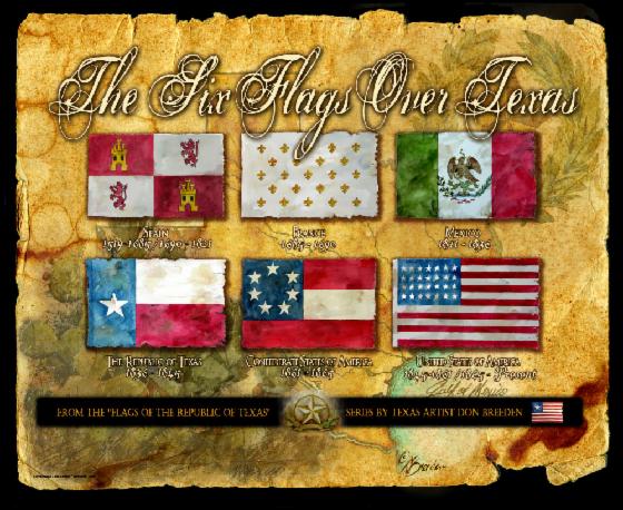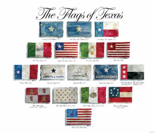 The six flags which flew over Texas; most people can't remember all six. The flag images are taken from my individual original water colors, and make up an attractive and historical display.